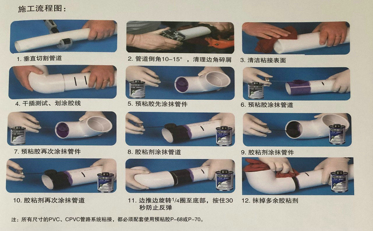 溶劑黏膠必須在管表面清潔劑作用完畢后涂上。接合表面必須被浸透而且軟化。黏膠應(yīng)以管直徑一半大小的天然鬃刷涂上。管末端外面應(yīng)涂厚層黏膠,配件套接內(nèi)面應(yīng)涂中等厚度黏膠。大于DN50的管在其末端涂上第二層黏膠或相對(duì)增加涂抹次數(shù)。